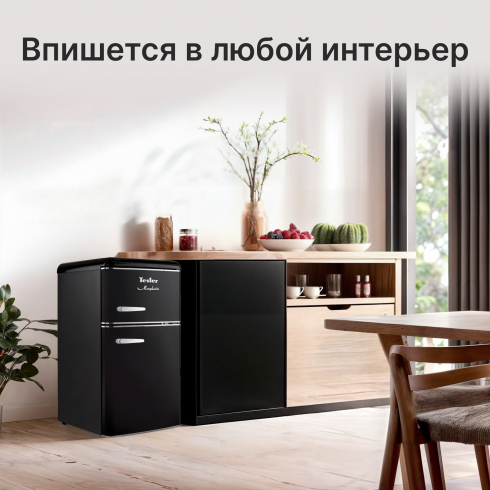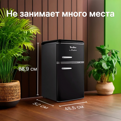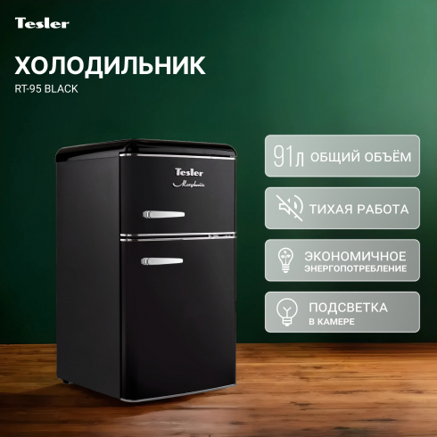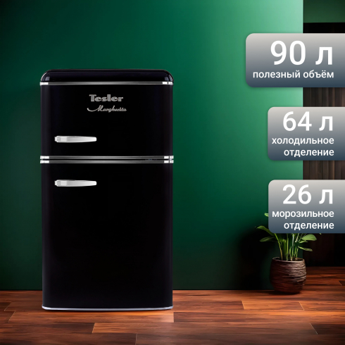• Отдельностоящий холодильник Tesler RT-95 сочетает в себе классический ретро-дизайн и современные функции.