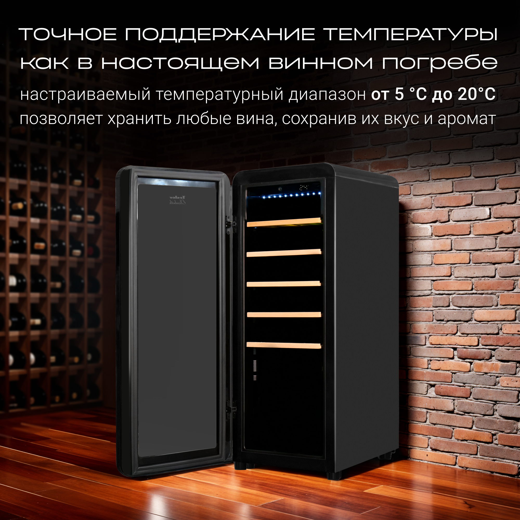 • Диапазон поддерживаемой температуры – от 5°C  до 20 °C, что позволяет хранить любые сорта вина.