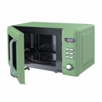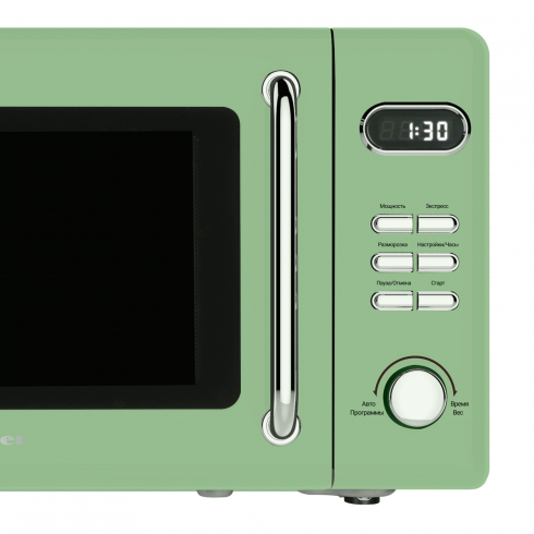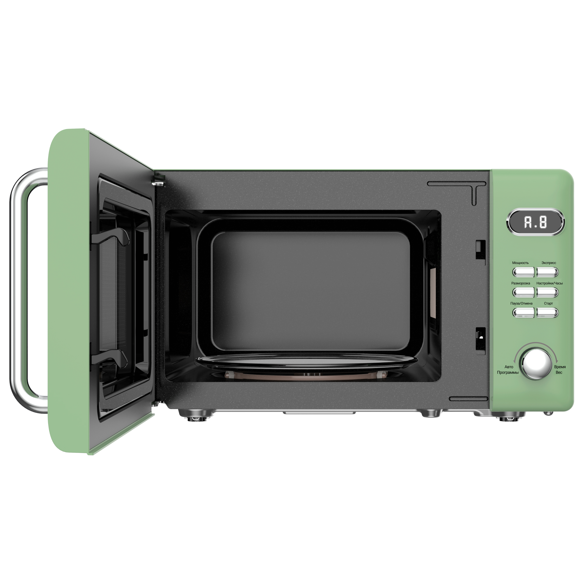 Энергопитание от стандартной сети 220 В. Конструкция оснащена ротационным механизмом с рабочей поверхностью 24 см, обеспечивающим симметричный прогрев пищевых продуктов за счет циклического перемещения в камере.