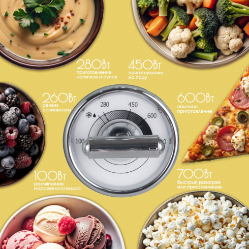 Максимальная мощность подходит для быстрого приготовления или разогрева блюда. Высокая (85%) нужна для обычного приготовления. Средняя (66%) — приготовление на пару. Низкая (40%) — разморозка/приготовление напитков и супов. Режим разморозки - мощность 37%. Минимальная мощность (17%) подходит для поддержания пищи теплой, размягчения мороженого и масла, медленной разморозки.