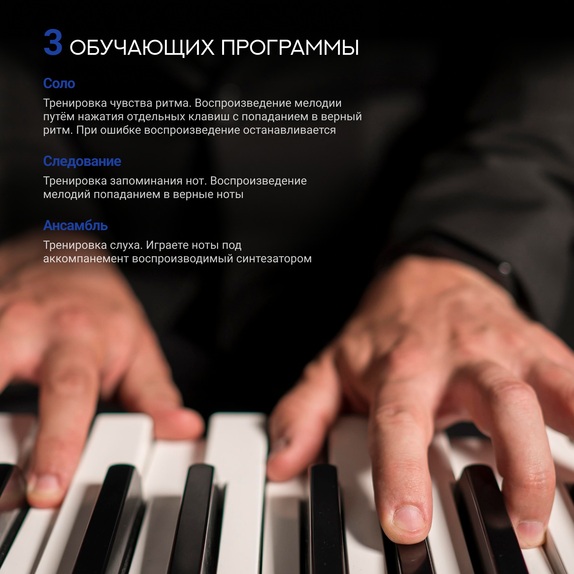 Обучающие программы «Соло», «Следование» и «Ансамбль» помогут начинающим в освоении игры на синтезаторе, позволяя тренировать слух и чувство ритма. Суть упражнений состоит в том, чтобы "набить руку": воспроизводится мелодия, аккомпанируемая нотами, которые проигрывает пользователь. Оттачивайте навыки, играя вместе с демо-песнями.