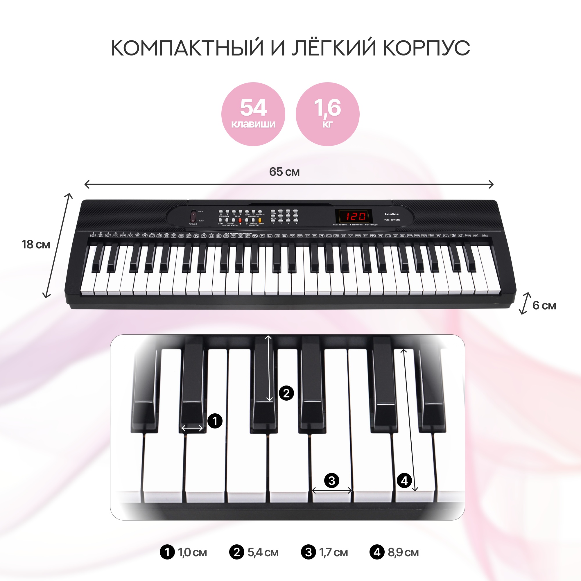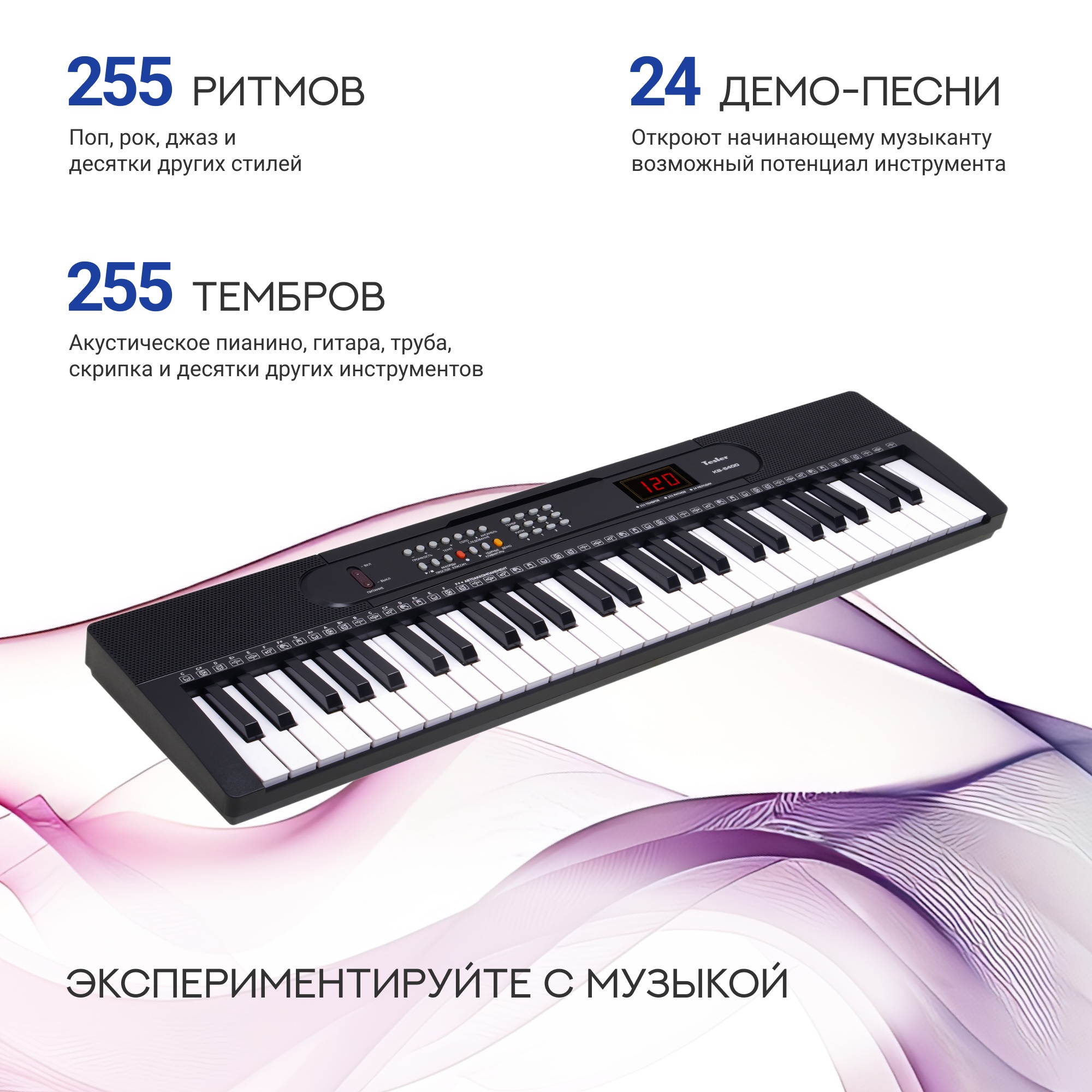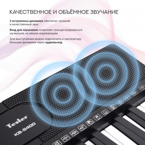 Синтезатор Tesler KB-5400 с клавиатурой на 54 клавиши и широким выбором тембров и ритмов, возможностью записи произведений, подойдет как для начинающих, так и продолжающих обучение.