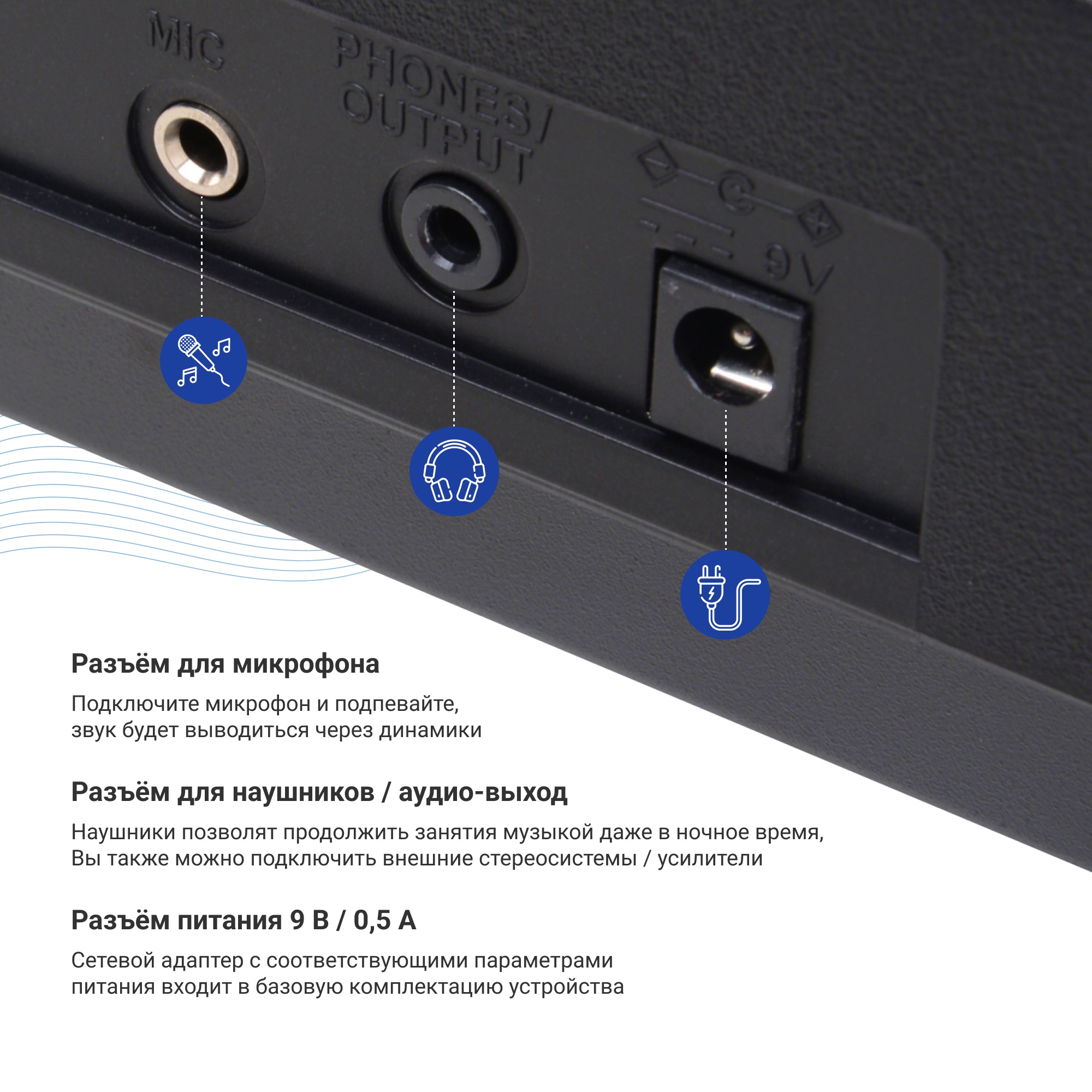 Музыкальный инструмент оснащён двумя портами для подключения микрофона и наушников Jack 3,5 мм, которые обеспечивают возможность репетиций в любое время суток без нарушения тишины и опцию синхронного исполнения партий инструментального сопровождения и вокального аккомпанемента. Данная конфигурация портов расширяет возможности инструмента, трансформируя его в многофункциональную рабочую станцию. Также, возможно подключить внешние стереосистемы через соответствующие разъемы.