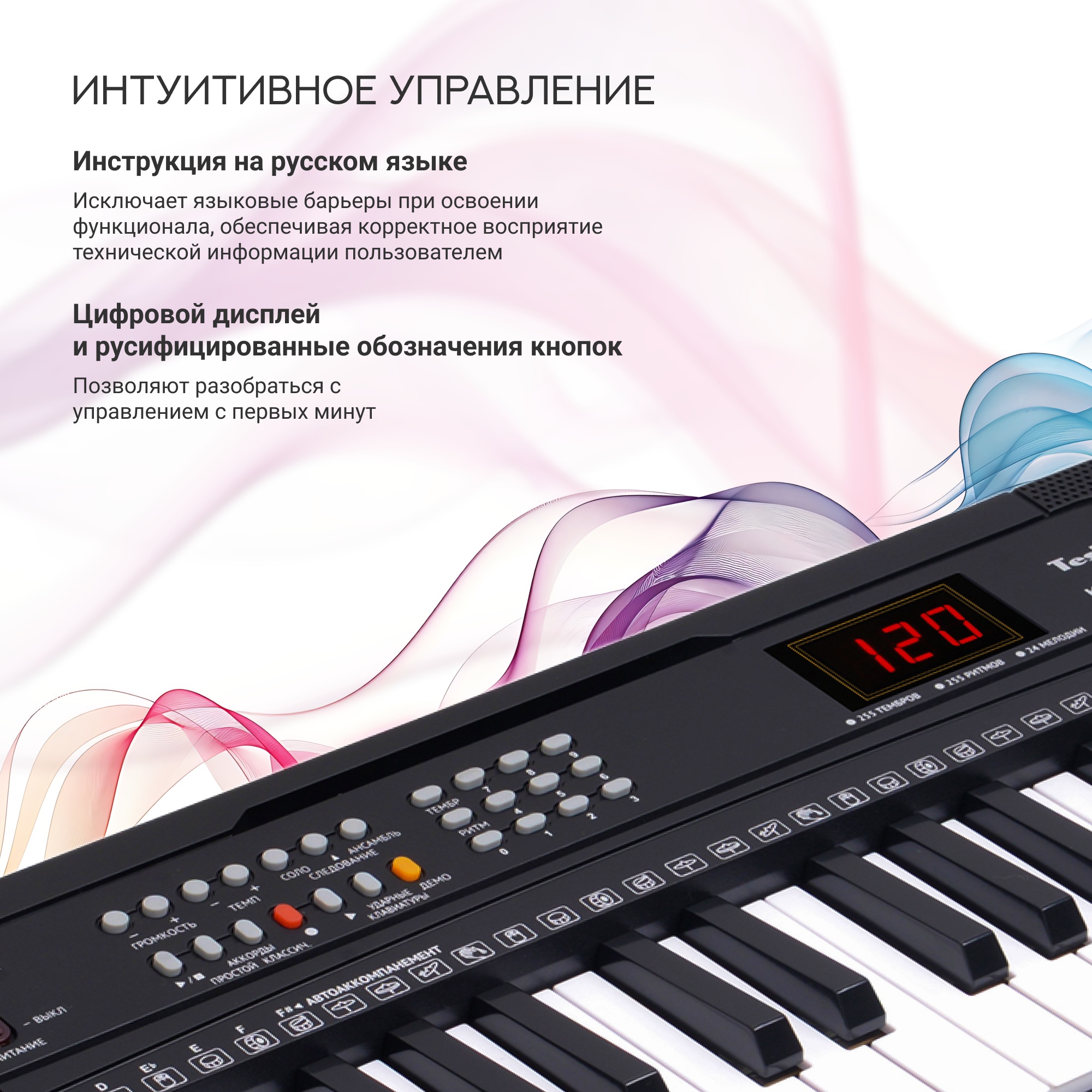 - качественное звучание, 54 клавиши, 255 тембров, 300 ритмов, 24 демо мелодии;