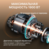 Двигатель с медной обмоткой и мощностью до 1900 Вт, обеспечивает стабильную работу даже при высокой нагрузке. Цельнометаллический редуктор надёжен и тих в работе, легко справляется с замесом густого теста. Встроенная защита от перегрева автоматически регулирует нагрузку и предотвращает перегрузки. Конструкция машины продумана для удобства: простое управление и лёгкая очистка.