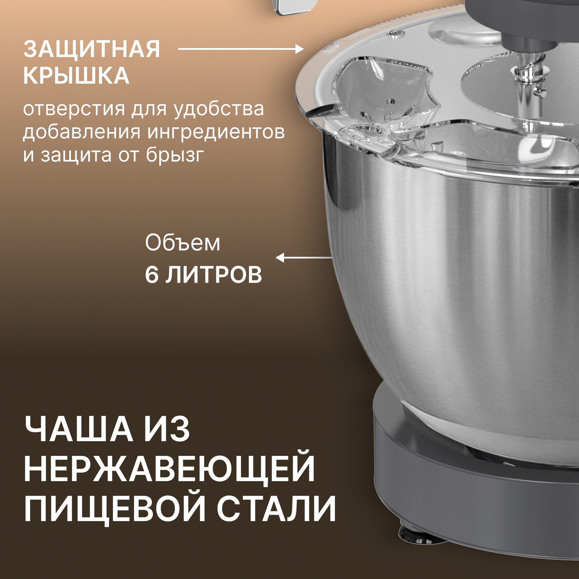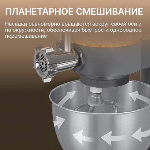 Планетарная система смешивания обеспечивает равномерную обработку ингредиентов: насадки вращаются одновременно вокруг своей оси и по окружности чаши. Вместительная чаша из нержавеющей стали на 6 литров позволяет замешивать большие объёмы продуктов. Максимальная скорость — до 210 оборотов в минуту.