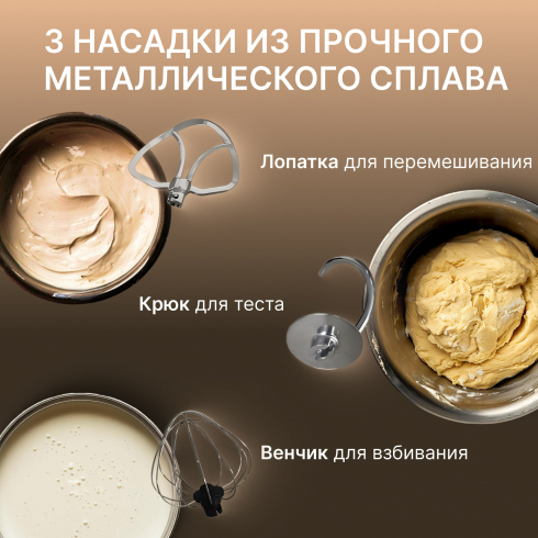 • Высокая мощность 1900 Вт позволяет замешивать жидкое и густое тесто, готовить соусы, кулинарные смеси и кремы.