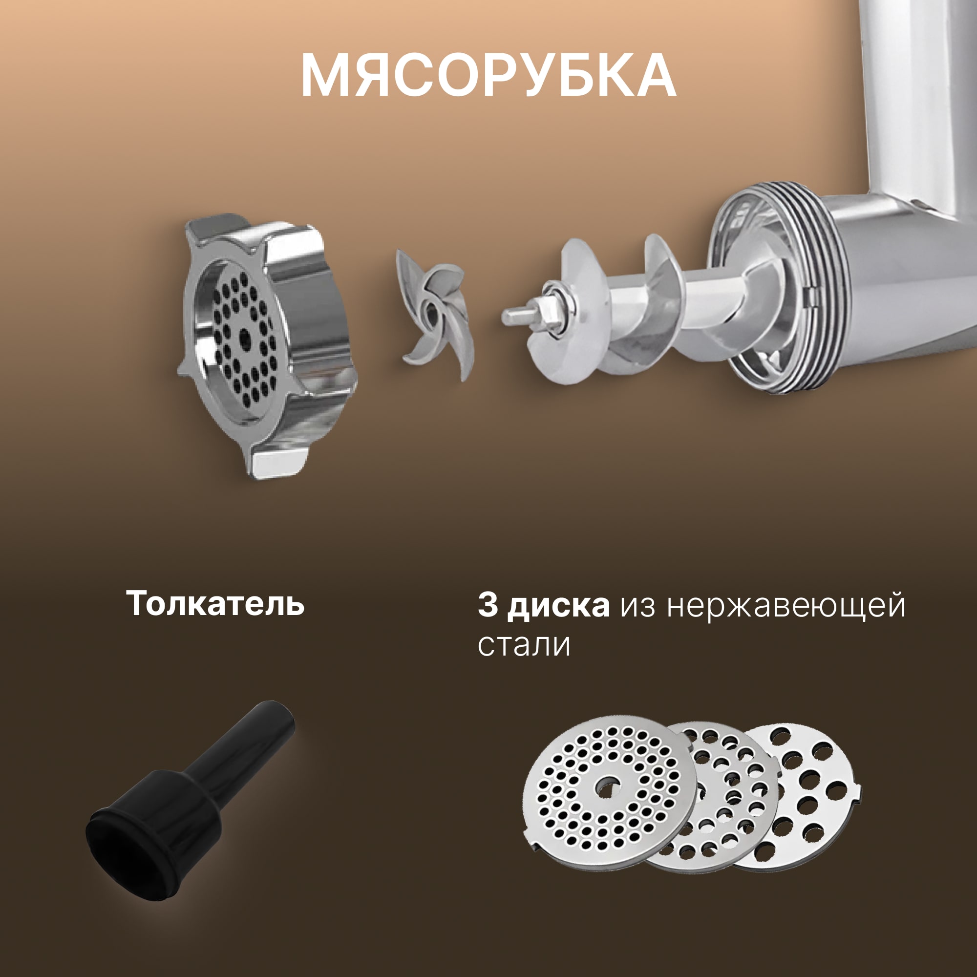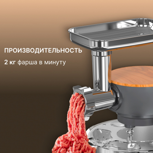 Мясорубка оборудована мощным шнеком и стальными ножами, подходящими для мяса любой жирности. Скорость вращения — до 210 об/мин, производительность — до 2 кг фарша в минуту. Металлический лоток более гигиеничен и долговечен по сравнению с пластиковыми аналогами. Съёмные элементы упрощают очистку.