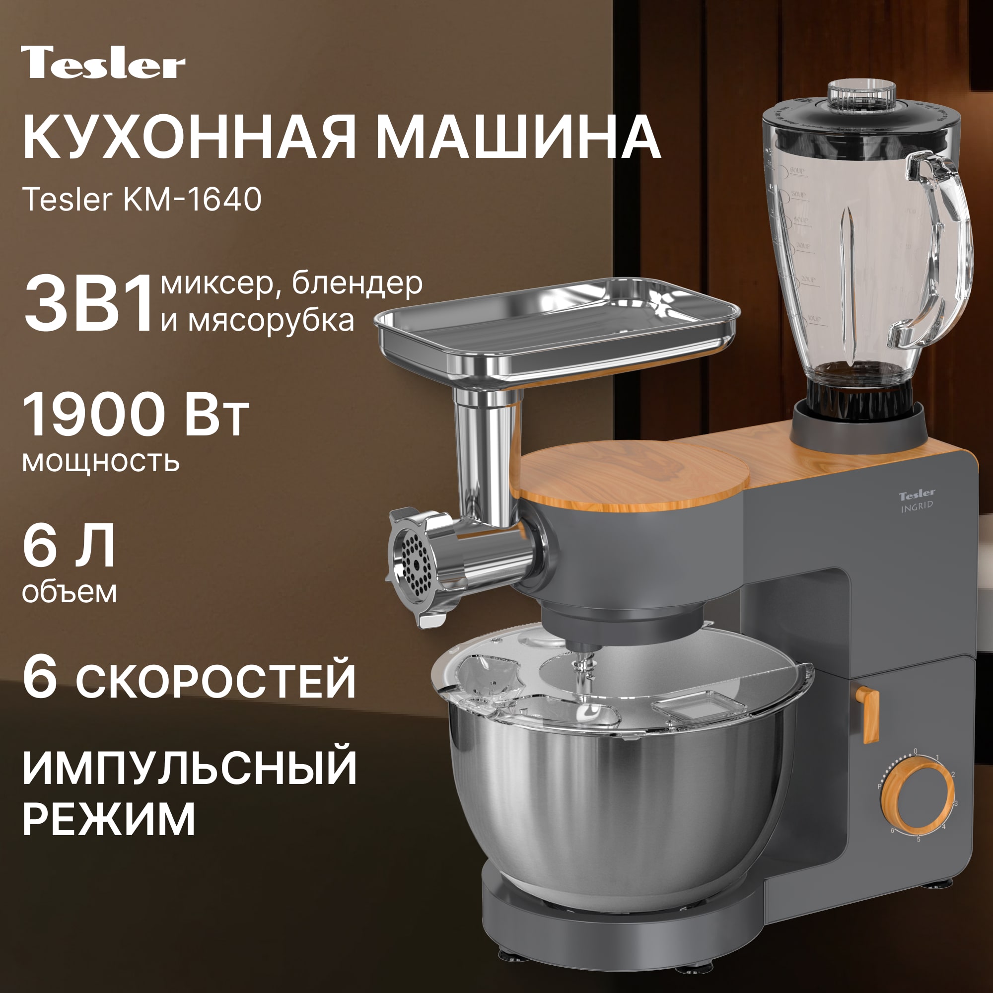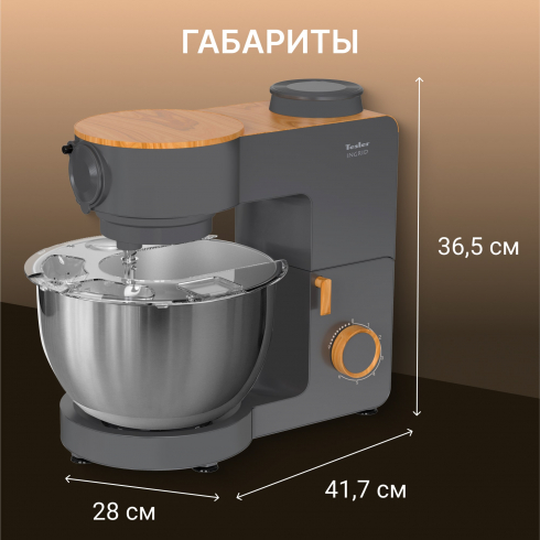 Tesler KM-1640 — мощная и многофункциональная кухонная машина, совмещающая планетарный миксер, блендер и мясорубку.