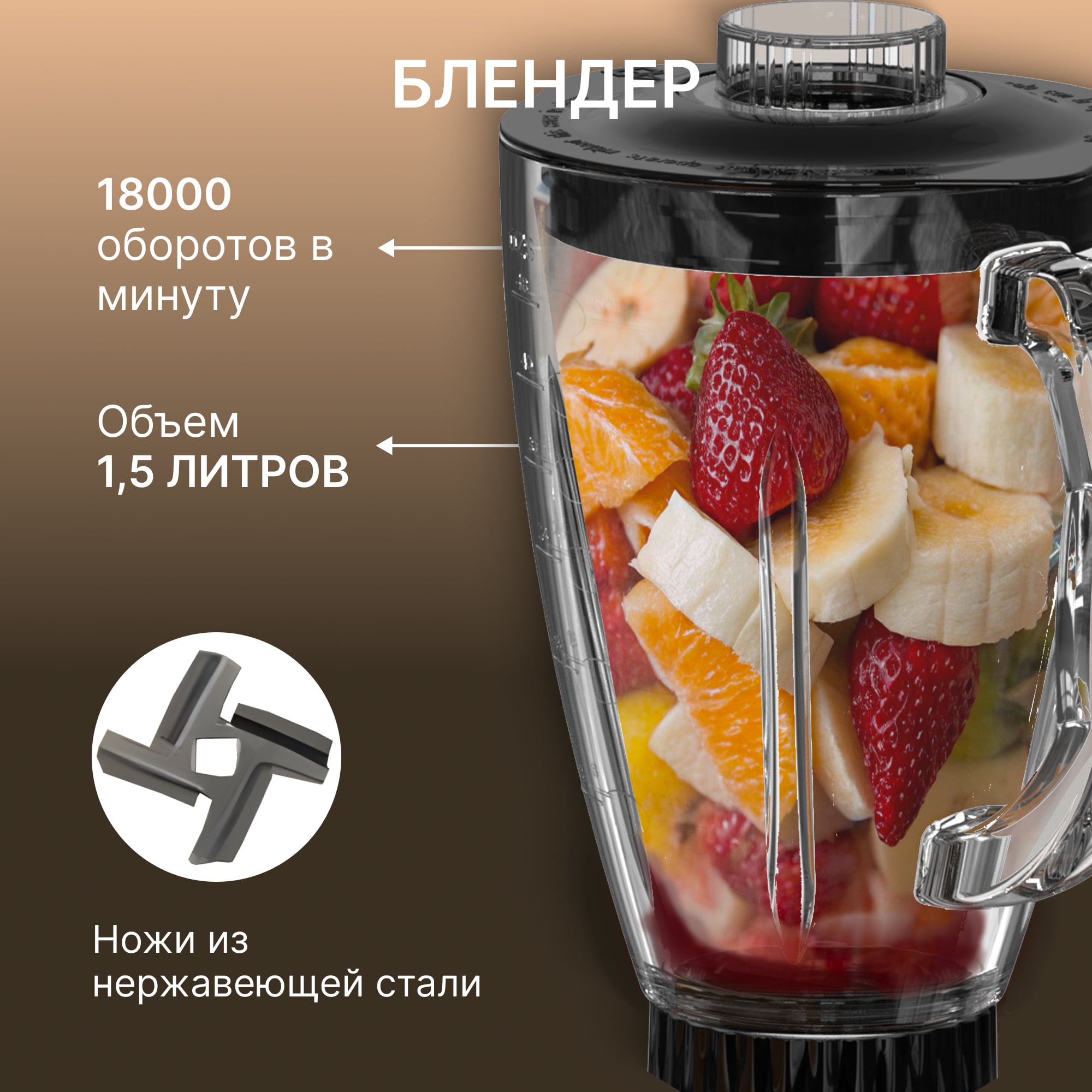 Блендер оснащён отдельной чашей из закалённого стекла объёмом 1,5 литра с острыми ножами из нержавеющей стали. Он легко справляется с льдом, орехами и твёрдыми овощами. Доступны шесть скоростей и импульсный режим для точного контроля консистенции смузи, соусов и детского питания. Максимальная скорость — 18 000 об/мин. Крышка оснащена отверстием для добавления ингредиентов во время работы.
