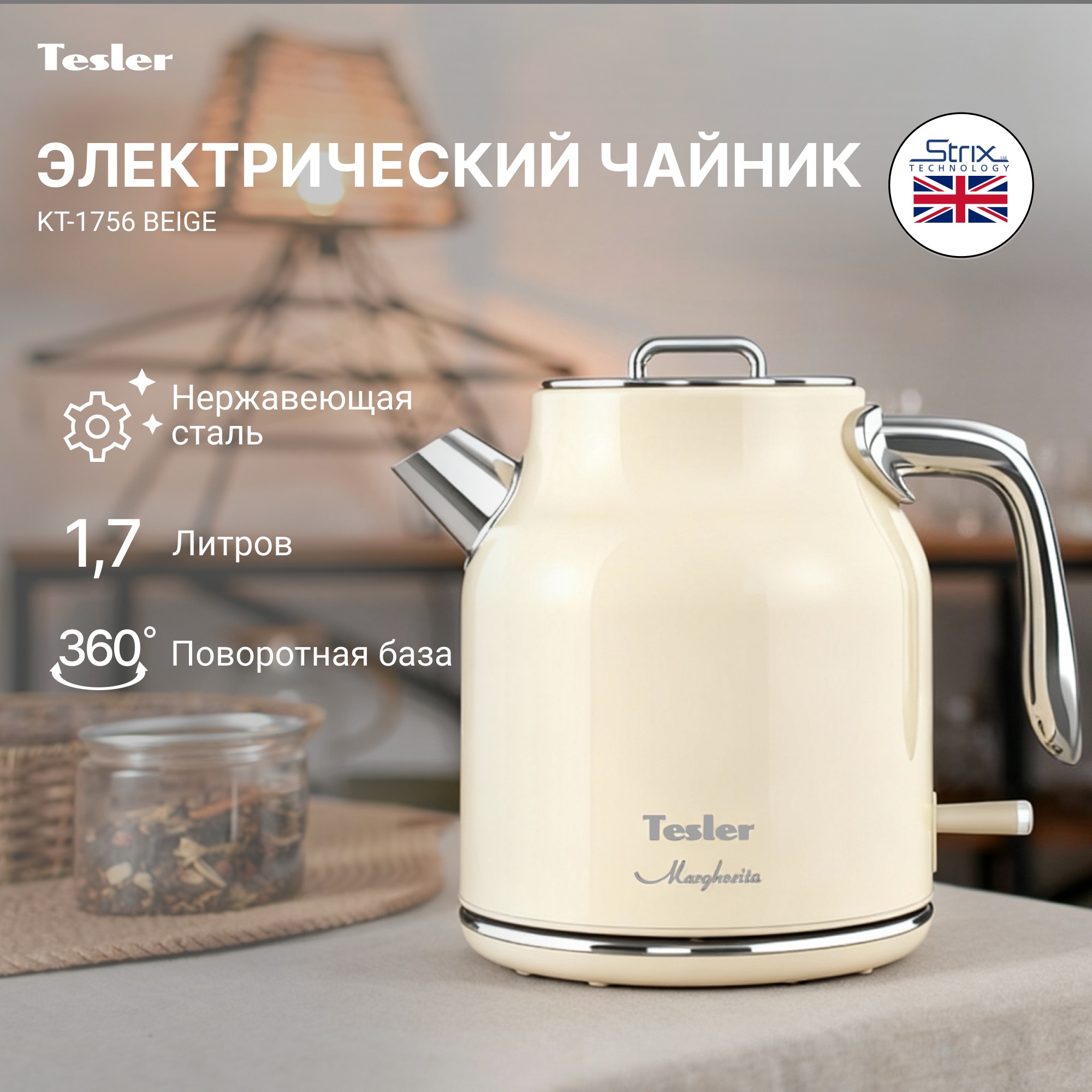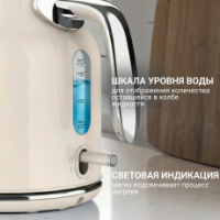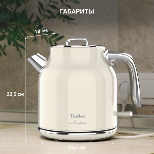 Электрический чайник Tesler Margherita  KT-1756 — техника, в которой современный минимализм сочетается с мягкими ретро-линиями. Лаконичная форма, хромированные детали и приглушенные гармоничные оттенки делают модель выразительным акцентом кухни, а продуманная конструкция отвечает за уверенное и безопасное использование.