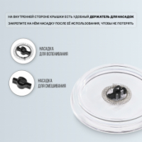 Крышка прибора оснащена специальным силиконовым кольцом, которое обеспечивает её герметичное прилегание и надежную фиксацию во время процесса вспенивания. На крышке располагается удобный держатель для насадок.