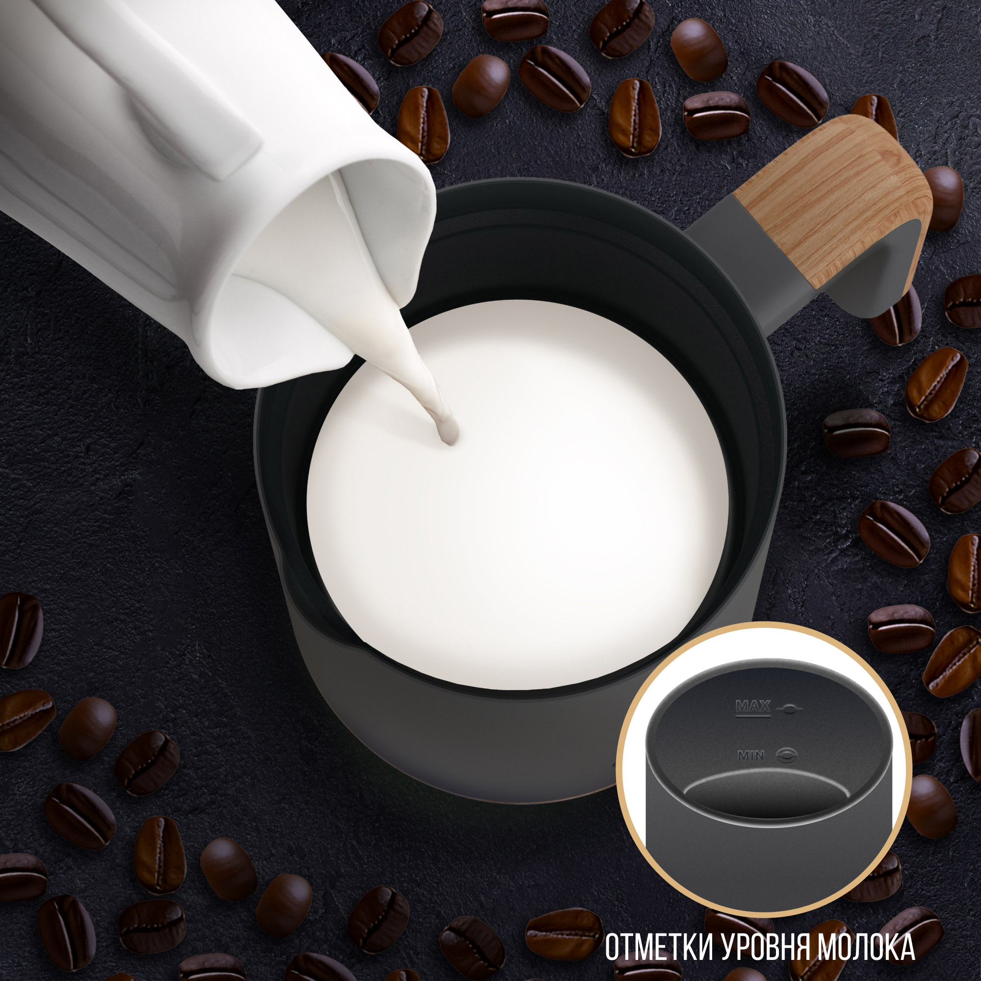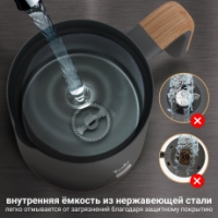 Объем ёмкости капучинатора составляет 240 мл, что идеально подходит для создания молочной пены на одну или две порции кофе. Внутри нанесена разметка, показывающая максимальный и минимальный объём жидкости для разных режимов. Корпус прибора выполнен из нержавеющей стали.