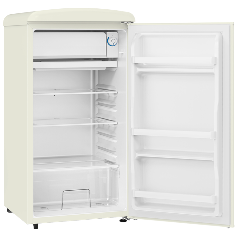 Полезный объём холодильника составляет 90 л. Внутреннее пространство организовано просто и удобно: в верхней части расположено отделение с пониженной температурой, ниже — стеклянные полки для повседневных продуктов, в дверце предусмотрены полки для напитков, соусов и небольших упаковок. Внизу находится ящик для овощей и фруктов. Такая компоновка помогает рационально использовать каждый уровень хранения и поддерживать порядок внутри камеры.