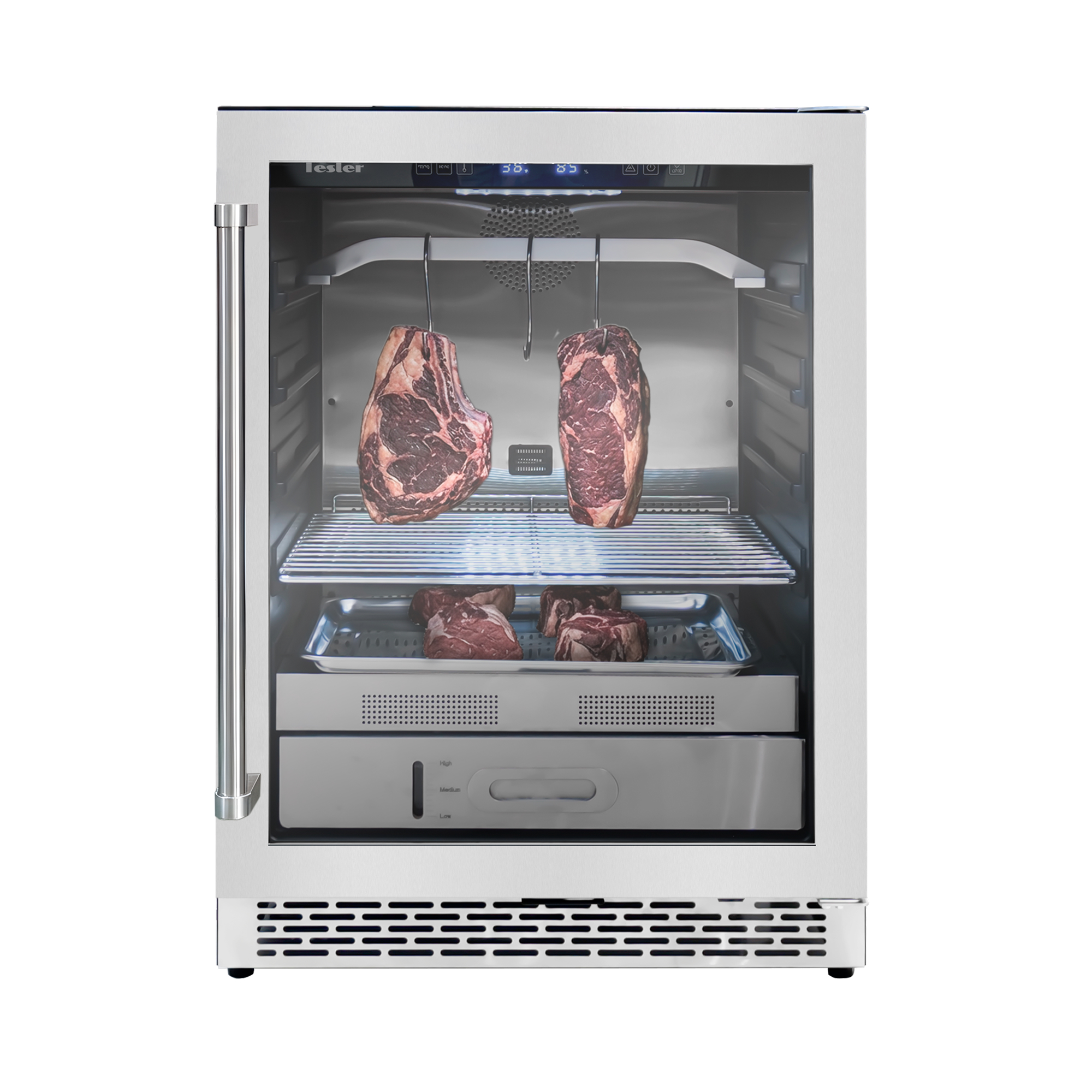 Tesler RDA-120 — это компактный шкаф для сухого вызревания мяса, созданный для тех, кто ценит точность, контроль и профессиональный результат. Он позволяет воспроизвести условия ресторанного dry aging в домашних или профессиональных условиях, сохраняя баланс между технологичностью, эстетикой и удобством использования.