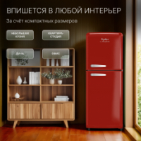 Ретро-стиль холодильника RT-110 наполняет пространство уютной эстетикой, а его компактные размеры позволяют рационально использовать пространство в небольших помещениях. Поэтому это идеальный вариант для небольших кухонь, квартир – студий и дачных домов.