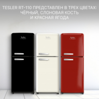 • Холодильник Tesler RT-110 выполнен в винтажном стиле ретро и представлен в нескольких цветах: чёрный,  слоновая кость и красная ягода
