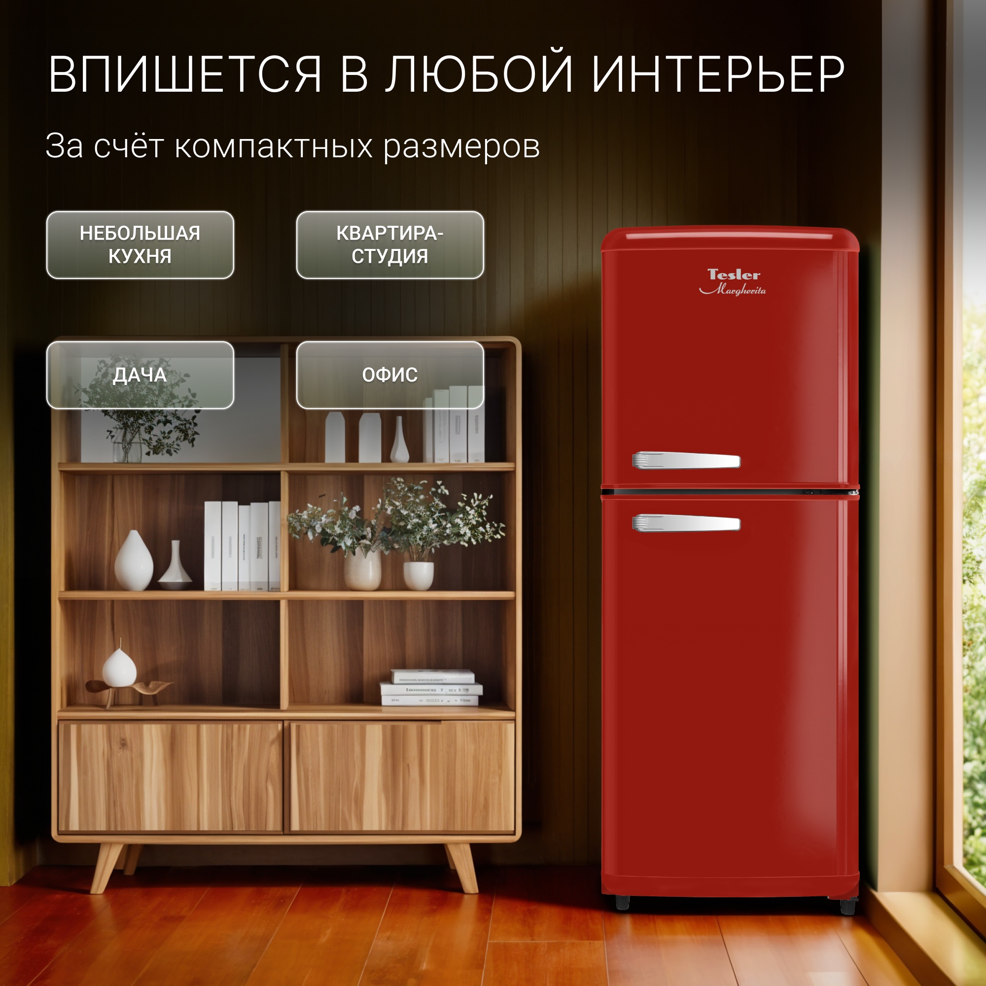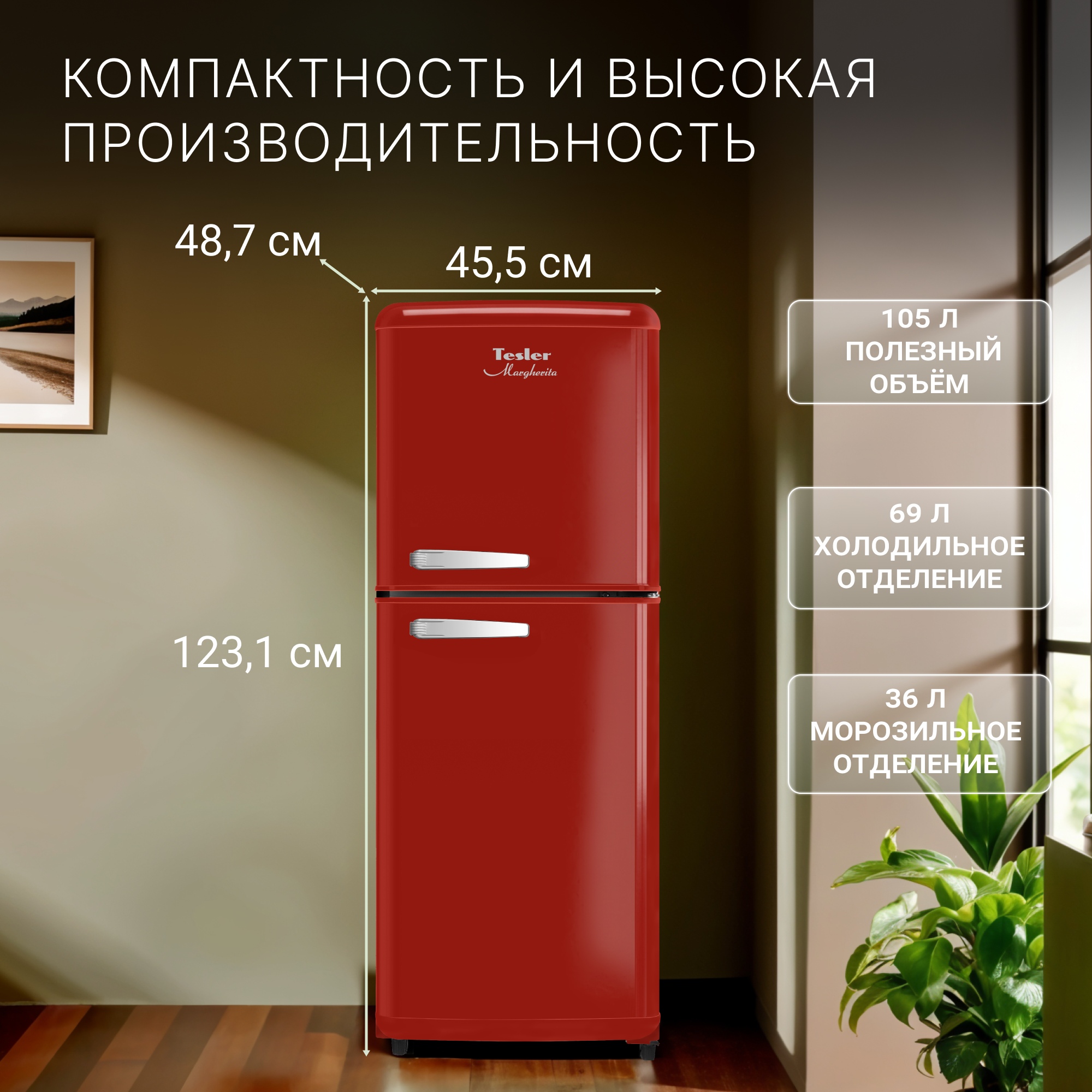 • Холодильник Tesler RT-110 сочетает в себе классический ретро-дизайн и современные функции.