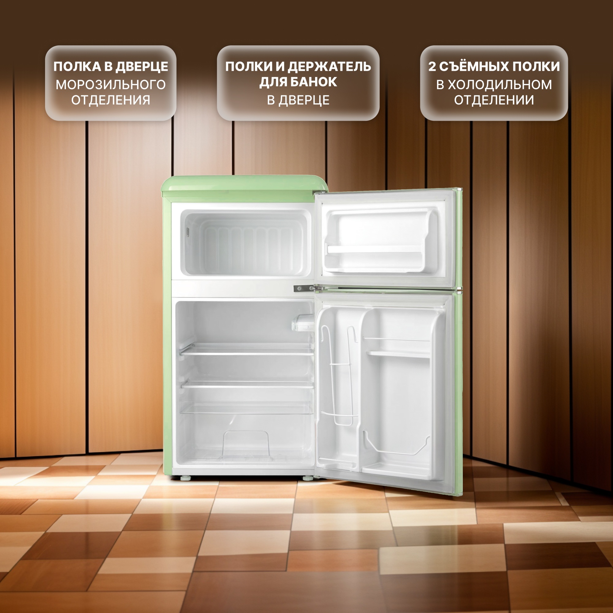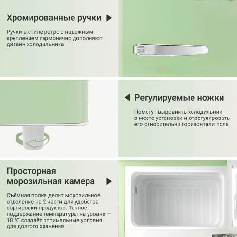 Холодильник Tesler RT-95 сочетает в себе надежное охлаждение, элегантность и функциональность. Выполненный в ретро-стиле, он придаёт особый шарм пространству вокруг, что делает его идеальным дополнением к кухне. Благодаря небольшим размерам он может быть установлен даже в ультракомпактных пространствах.