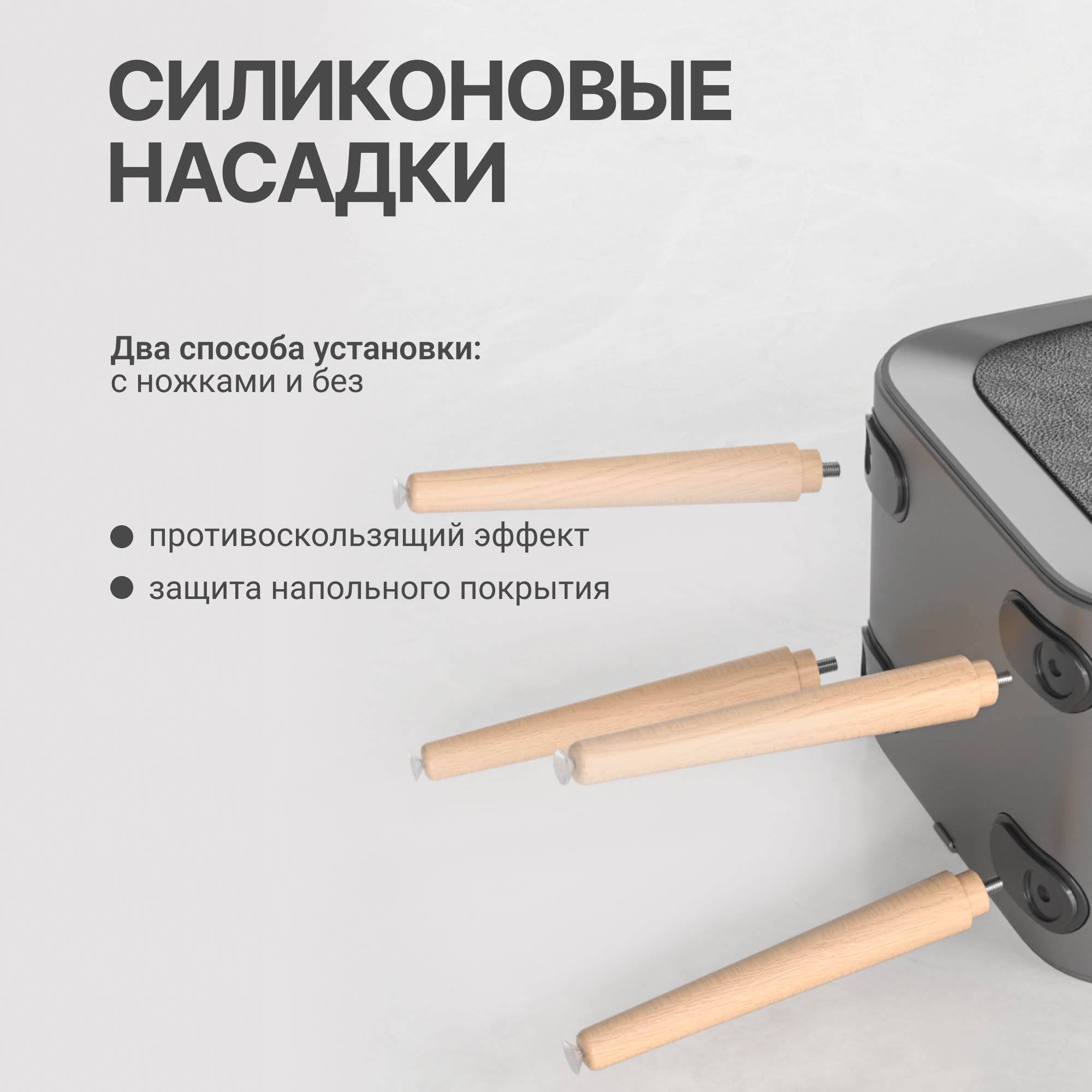 Главной отличительной особенностью является наличие отдельной фронтальной дверцы с хромированной ручкой. Данное конструктивное решение обеспечивает прямой доступ к внутреннему пространству для обслуживания без необходимости взаимодействия с основной сенсорной крышкой. Модель комплектуется декоративными ножками, которые придают изделию ретроспективный облик и запоминающийся внешний вид.