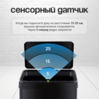 Умное ведро для мусора Tesler STB-50F – это простое и технологичное решение утилизации отходов. Сенсорный датчик самостоятельно открывает крышку при поднесении руки на расстояние 15-25 см от датчика. Больше не нужно прикасаться к ведру, чтобы выкинуть мусор, и ваши руки останутся чистыми. Крышка автоматически закроется сама через 5 секунд. Предусмотрен также ручной режим, в котором управлять открытием и закрытием крышки контейнера можно кнопкой, расположенной на фронтальной панели ведра. Питание осуществляется посредством 4-х батареек АА (не входят в комплект).