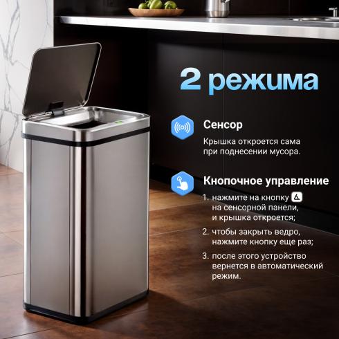 Умное ведро для мусора Tesler STB-60F – это простое и технологичное решение утилизации отходов. Сенсорный датчик самостоятельно открывает крышку при поднесении руки на расстояние 15-25 см от датчика. Больше не нужно прикасаться к ведру, чтобы выкинуть мусор, и ваши руки останутся чистыми. Крышка автоматически закроется сама через 5 секунд. Предусмотрен также ручной режим, в котором управлять открытием и закрытием крышки контейнера можно кнопкой, расположенной на фронтальной панели ведра. Питание осуществляется посредством 4-х батареек АА (не входят в комплект).