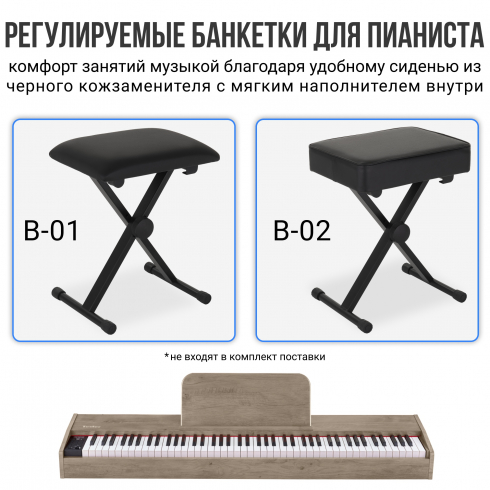 Вы также можете дополнительно приобрести подставку под данный инструмент – ST-8805. Она надёжно удерживает пианино во время игры благодаря креплению музыкального инструмента к своей основе. При установке цифрового пианино на данную подставку инструмент будет иметь ту же высоту клавиш, что и акустическое фортепиано, что подарит исполнителю комфорт при занятиях музыкой.