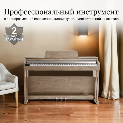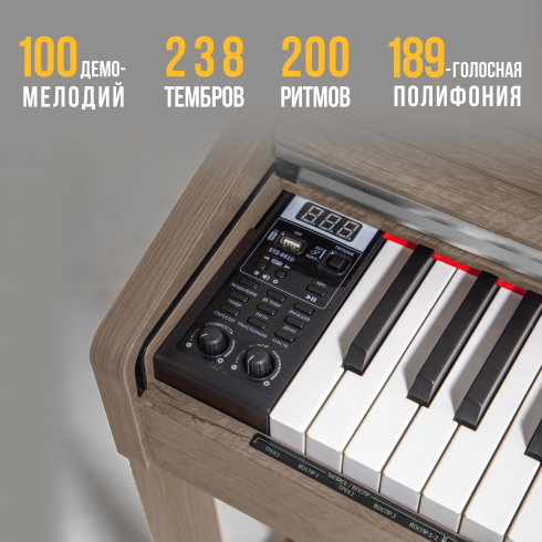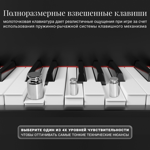 Полноразмерная молоточковая клавиатура дает реалистичные ощущения как при игре на акустическом инструменте за счет использования пружинно-рычажной системы клавишного механизма. Клавиши в нижнем регистре нажимаются немного тяжелее, а в верхнем регистре – легче, что помогает воспроизводить все нюансы тембров с глубокой градацией звуковой окраски, зависящей от силы удара.