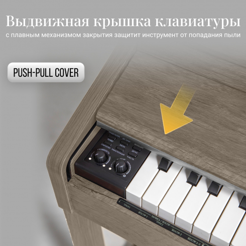 Пианино Tesler STZ-8810 оснащено выдвижной крышкой для клавиш с механизмом Push-pull. В отличии от стандартной откидной крышки, такая выдвижная конструкция исключает риск травмы из-за случайного захлопывания. После окончания игры вы можете закрыть сдвижную крышку клавиш, чтобы уменьшить количество пыли, попадающей внутрь. Это поможет сохранить инструмент в хорошем состоянии, и увеличить срок его службы.
