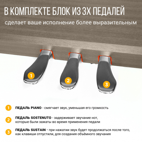 Для большей выразительности при исполнении, и сходства с акустическим фортепиано в данной модели цифрового пианино предусмотрено 3 педали. Педаль сустейна (правая) - при нажатии звук будет продолжаться после того, как клавиши отпустили, для создания объёмного звучания. Нажатие педаль пиано (левая) смягчает звук, уменьшая его громкость. После нажатия задерживающей педали (средняя) задержится звучание только тех нот, которые были зажаты во время применения педали.
