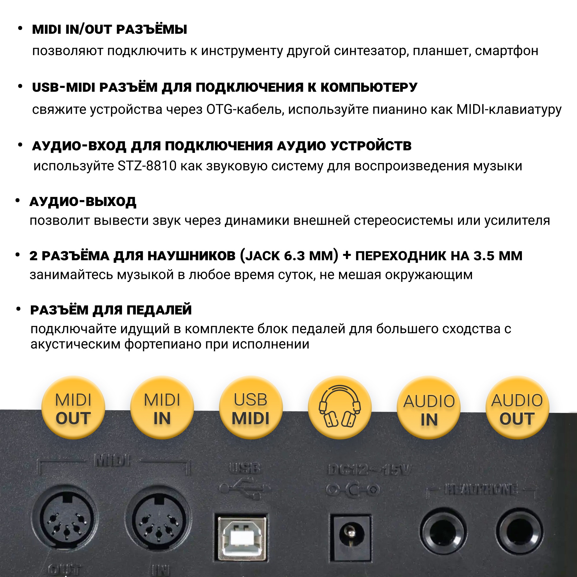 Tesler STZ-8810 — отличный вариант для тех, кто ценит качественный звук и функционал. Инструмент обладает ярким тембром концертного рояля, передающим краски от глубоких басов до хрустальных верхних регистров благодаря мощной стерео-акустической системе.