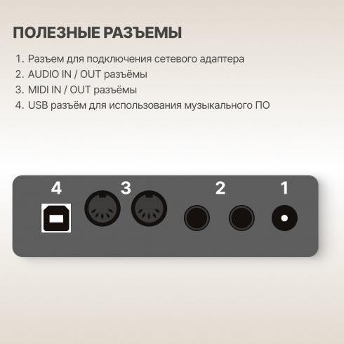 3. USB Type-B для подключения к компьютеру для использования музыкального ПО