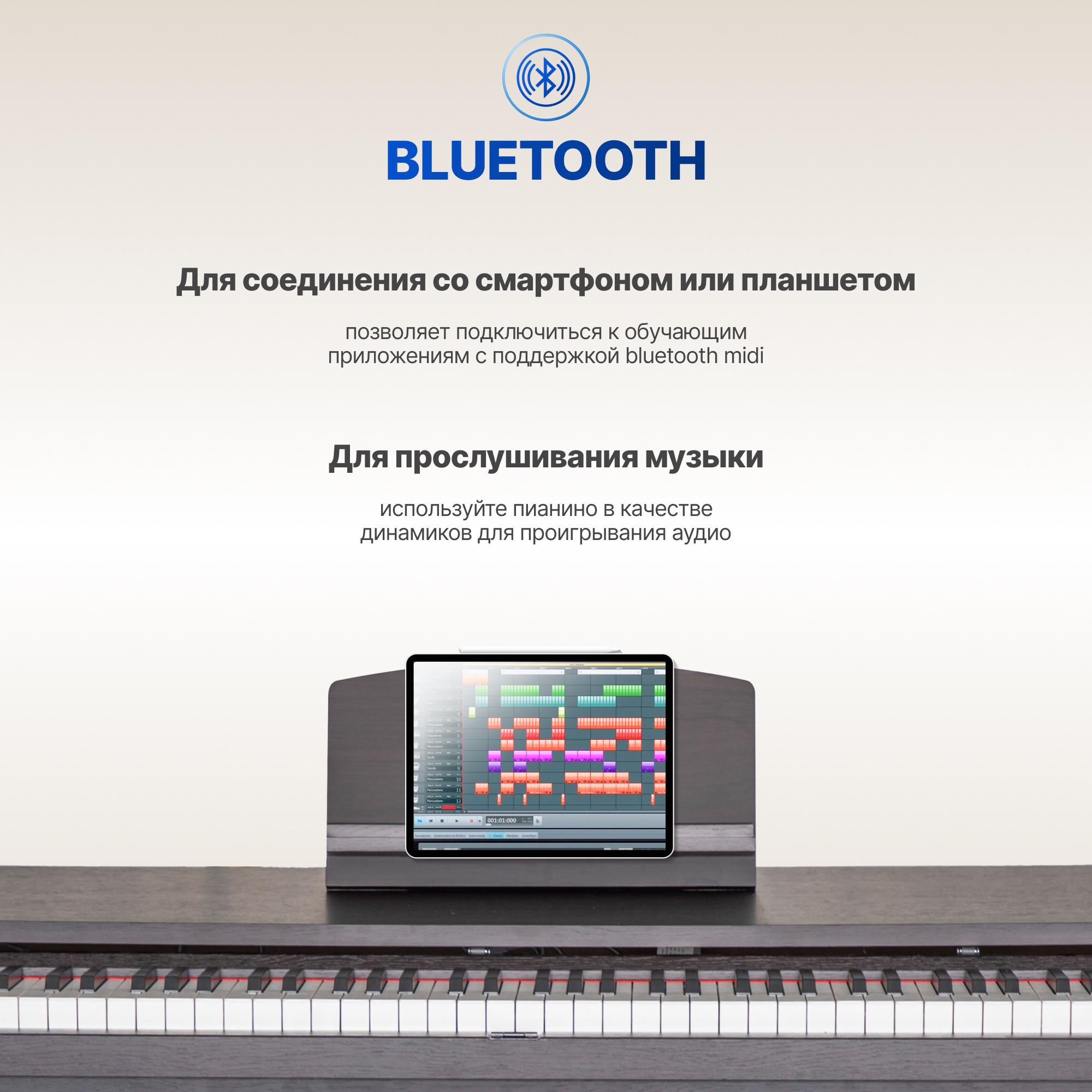 • Bluetooth-модуль для беспроводной интеграции со смартфонами и планшетами. Технология обеспечивает совместимость с образовательными приложениями (Bluetooth MIDI) и возможность потоковой передачи аудио через встроенные динамики.