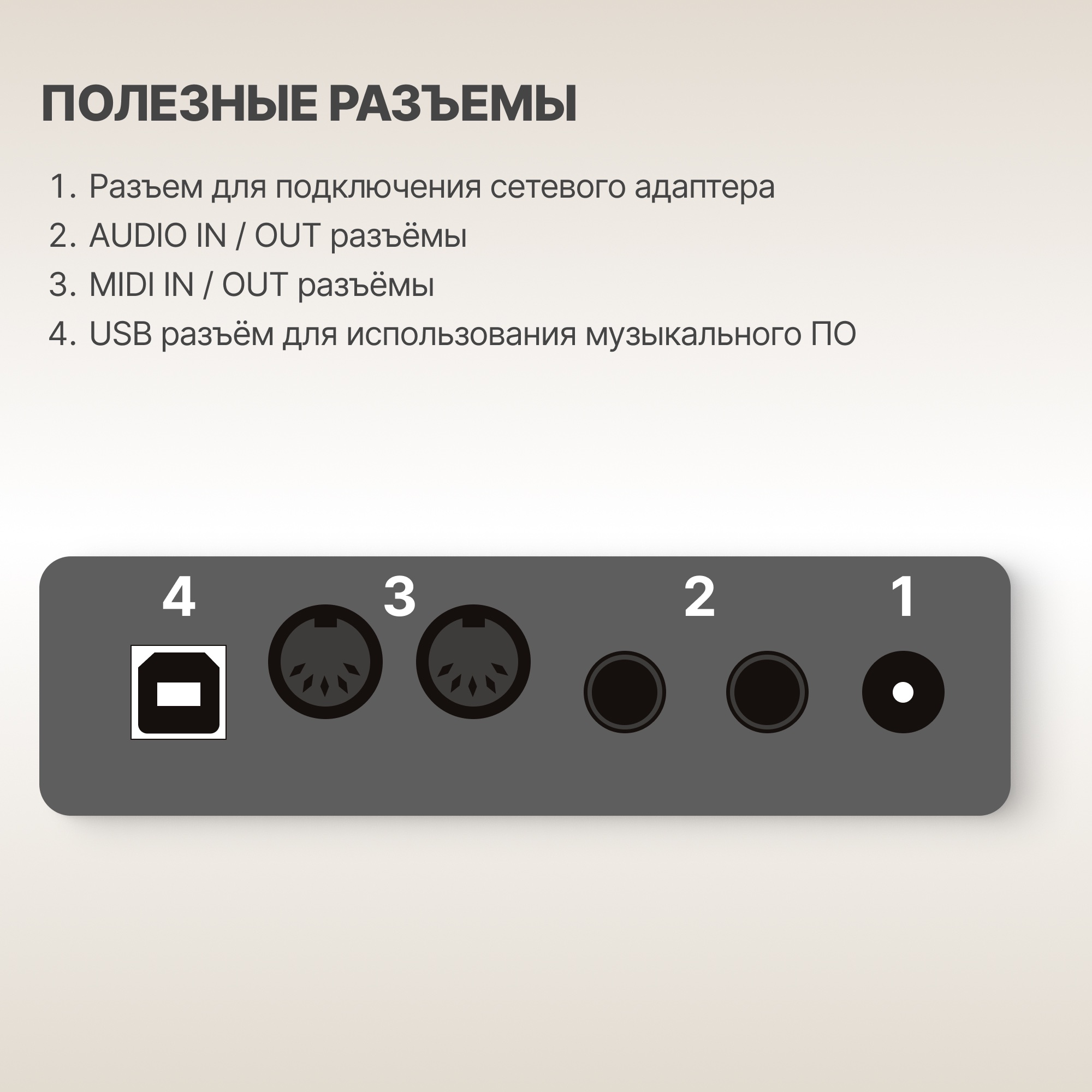 • MIDI разъём позволяют подключить к инструменту ноутбук, планшет или смартфон.