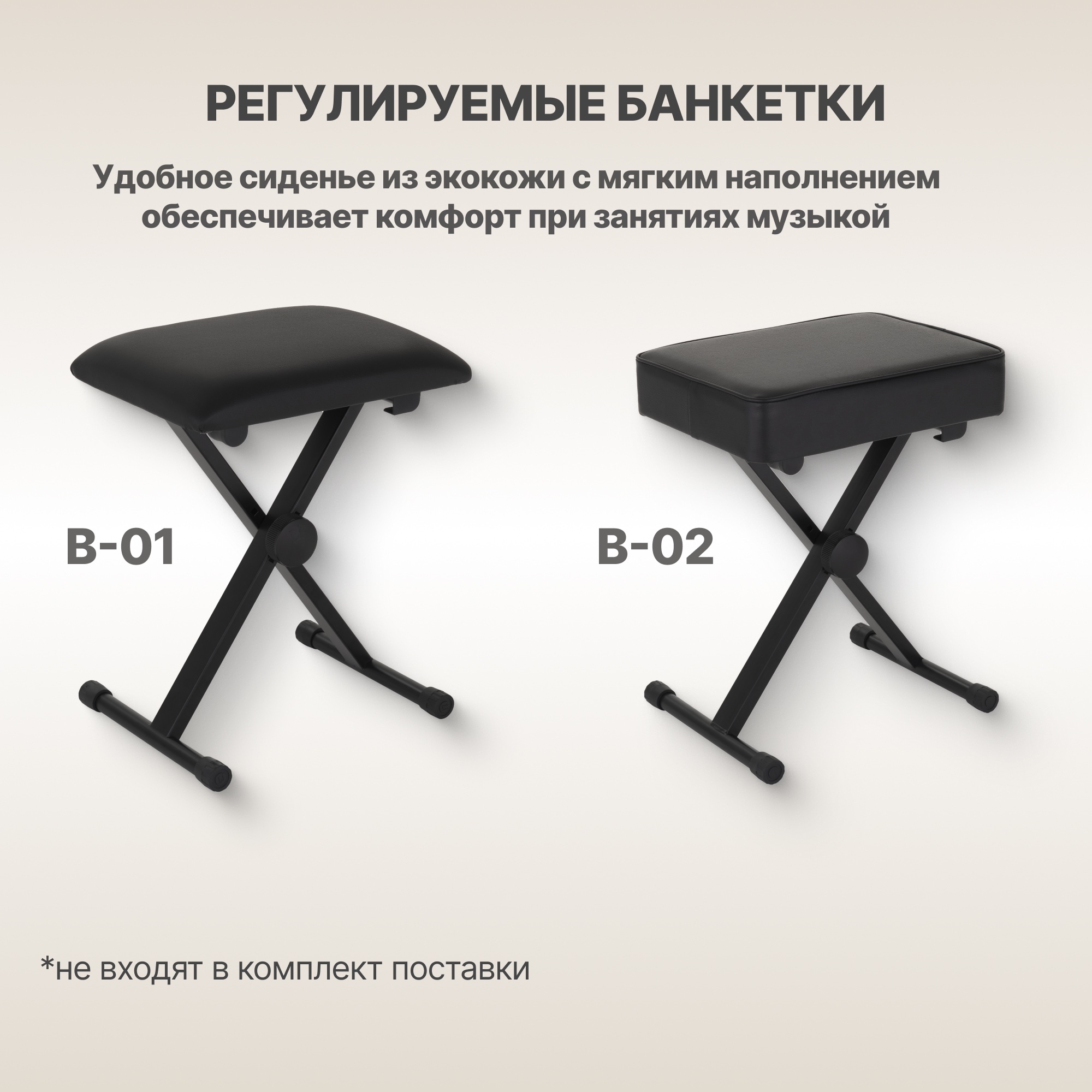 • В комплекте подставка с блоком из трёх педалей для большей выразительности при исполнении.