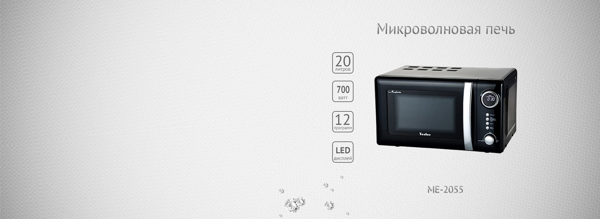 Микроволновая СВЧ-печь Tesler Margherita ME-2055 - бестселлер на вашей кухне! Свежий и современный дизайн особо подчеркивают выразительные цвета, в которых доступна вся линейка Margherita: красный, бежевый, черный, голубой. Корпус выполнен из окрашеной нержавеющей стали и высококачественного приятного на ощупь пластика. LED экран, органы управления и ручка дверцы микроволновой печи ME-2055 отделаны хромированными вставками, которые придают внешнему виду СВЧ-печи Tesler Margherita особый утонченный облик и капельку шарма. Небольшой размер позволит легко вписать эту микроволновую печь даже в самые компактные пространства кухни. Поверхность камеры печи со специальным покрытием Easy Clean препятствует налипанию пищи и образованию жировой пленки, легко моется и помогает поддерживать пространство внутренней камеры в чистоте.