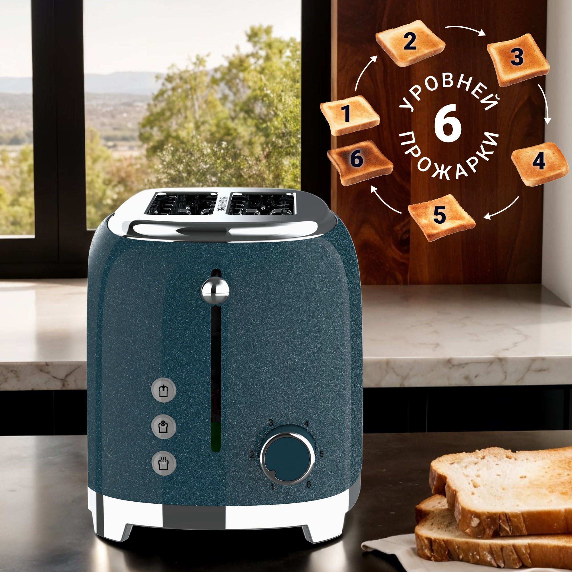 Шесть уровней прожарки позволяют точно настроить степень хрустящей корочки - от лёгкого золотистого оттенка до яркого румяного тоста.