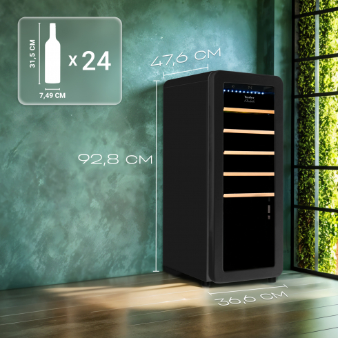 Преимуществом системы охлаждения данной модели является наличие компрессора, который использует хладагент для охлаждения внутреннего пространства, что обеспечивает стабильное поддержание температуры. Динамическая система охлаждения равномерно распределяет холод, что позволяет избежать застаивания запахов, и поддерживает постоянный уровень влажности. Температура внутри шкафа не зависит от температуры окружающей среды. Диапазон поддерживаемой температуры от 5 °C до 20°C помогает создать идеальные условия для хранения вина.