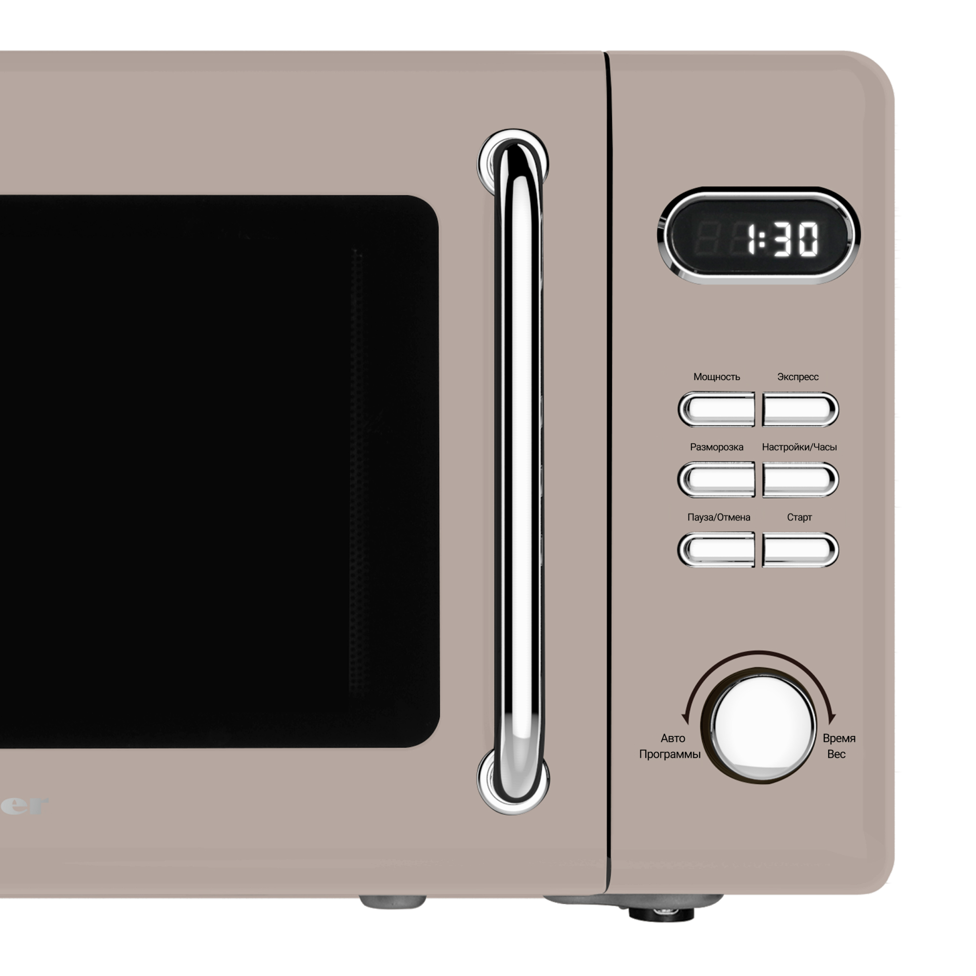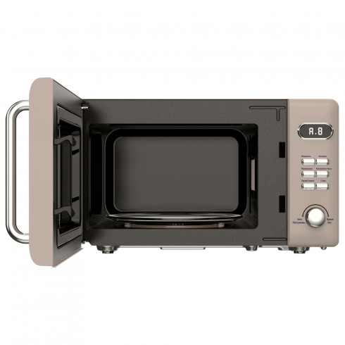 Энергопитание от стандартной сети 220 В. Конструкция оснащена ротационным механизмом с рабочей поверхностью 28 см, обеспечивающим симметричный прогрев пищевых продуктов за счет циклического перемещения в камере.