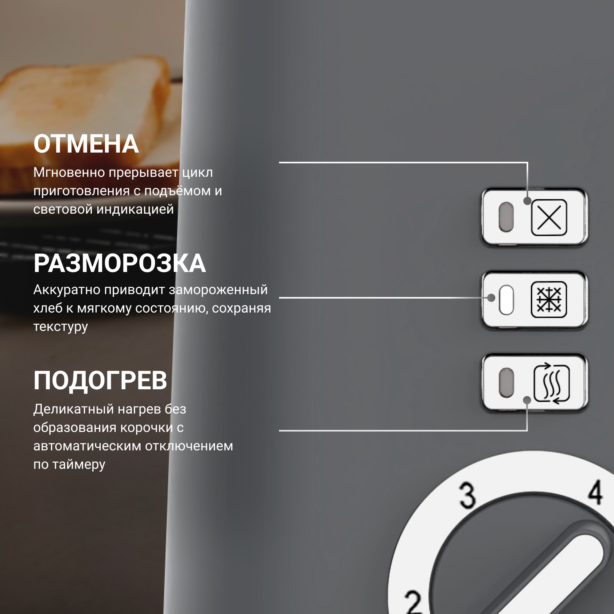 Модель оснащена тремя режимами работы: остановка, подогрев и приготовление замороженного хлеба. Кнопка отмены прерывает процесс приготовления в любой момент, позволяя извлечь продукт до завершения цикла. Подогрев предназначен для деликатного восстановления температуры уже готовых тостов без дополнительного поджаривания. Режим приготовления замороженного хлеба обеспечивает поэтапное повышение температуры, благодаря которому ломтики равномерно размораживаются и подрумяниваются без пересушивания.