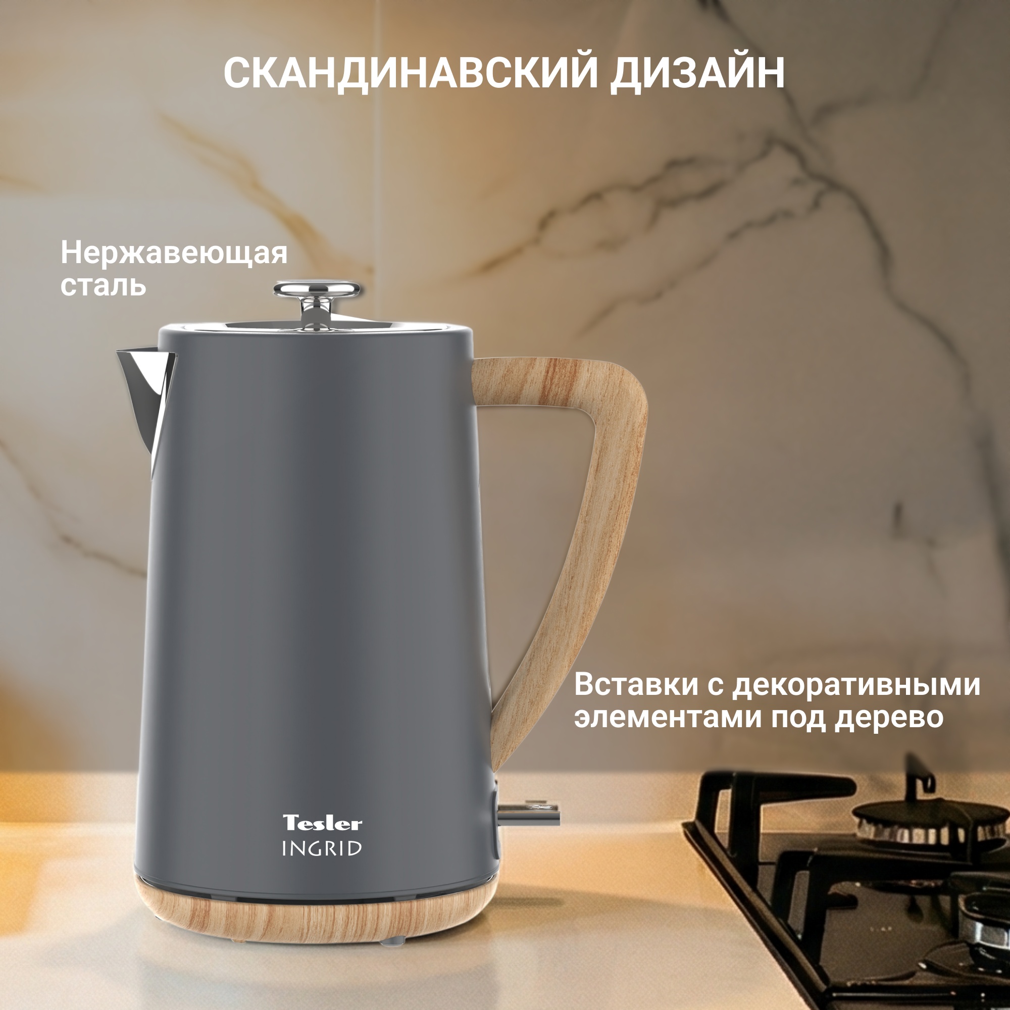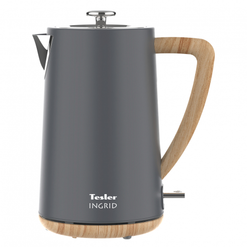 Электрический чайник Tesler INGRID KT-1744 представляет собой сочетание функциональности и эстетики. Корпус из нержавеющей стали с матовым покрытием и вставками, имитирующими натуральное дерево, подчёркивают визуальную гармонию и скандинавский стиль.