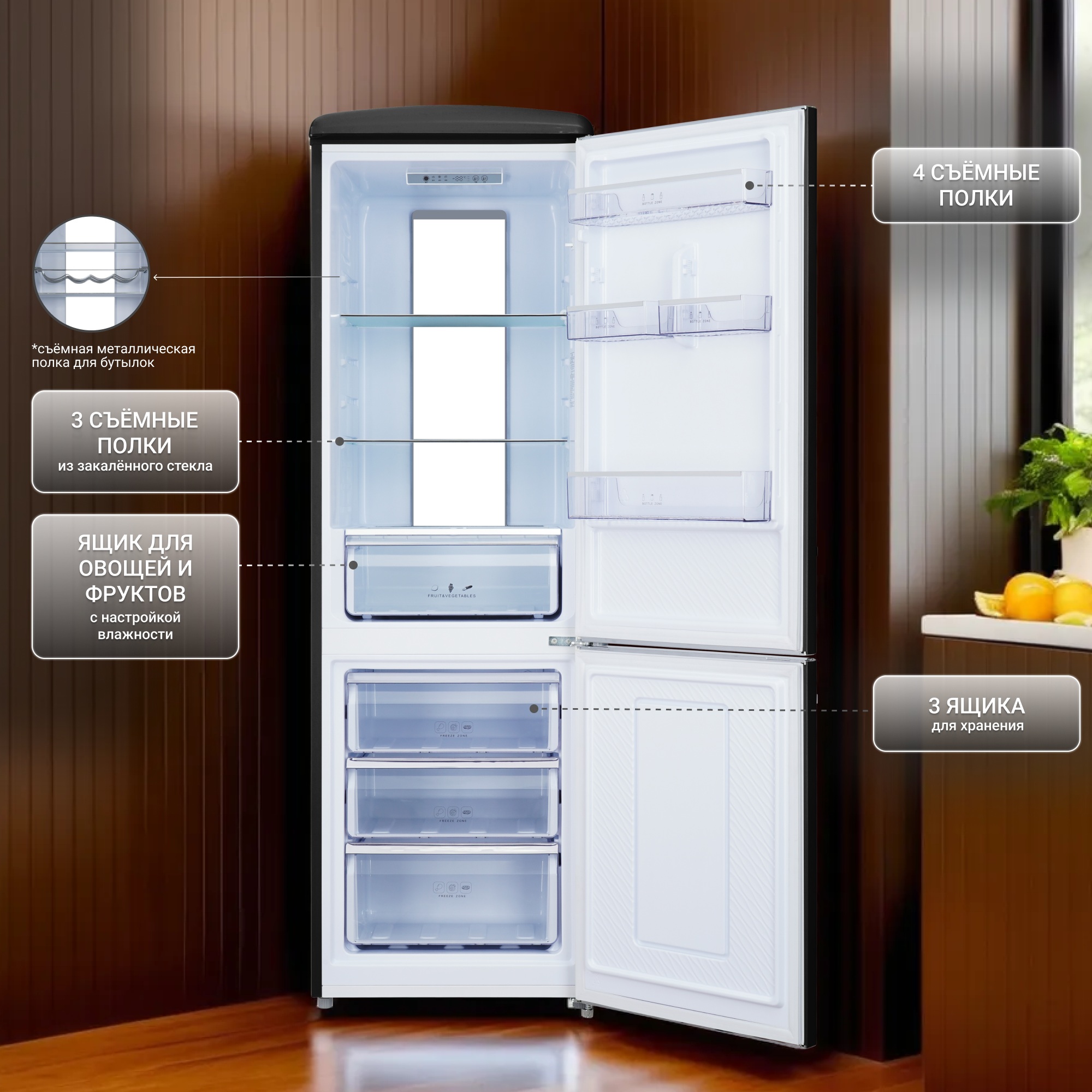 Модель, вдохновлённая эстетикой 60-х годов, станет ярким акцентом интерьера и подчеркнёт индивидуальность кухни. Лаконичные формы, оригинальные модные оттенки, литые металлические ручки придают холодильнику особый облик и уникальность.