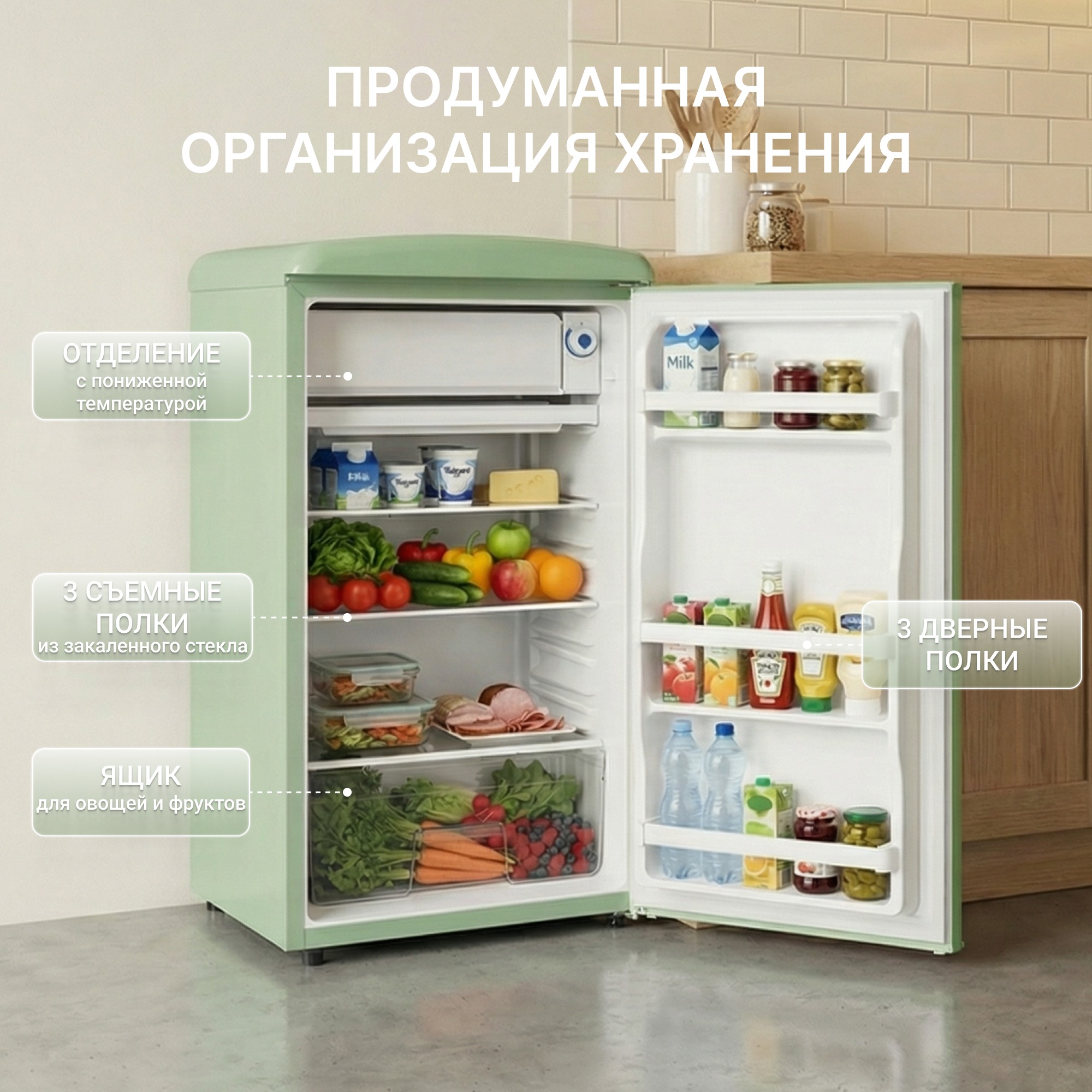 Полезный объём холодильника составляет 90 л. Внутреннее пространство организовано просто и удобно: в верхней части расположено отделение с пониженной температурой, ниже — стеклянные полки для повседневных продуктов, в дверце предусмотрены полки для напитков, соусов и небольших упаковок. Внизу находится ящик для овощей и фруктов. Такая компоновка помогает рационально использовать каждый уровень хранения и поддерживать порядок внутри камеры.