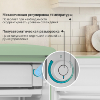 Холодильник автоматически поддерживает оптимальный температурный режим благодаря заводской настройке, а при необходимости уровень охлаждения можно скорректировать механическим регулятором. Модель оснащена полуавтоматической системой разморозки: цикл запускается нажатием кнопки на ручке управления, что делает уход более удобным. Холодильник соответствует классу энергопотребления A, что позволяет экономично расходовать электроэнергию при ежедневной эксплуатации.