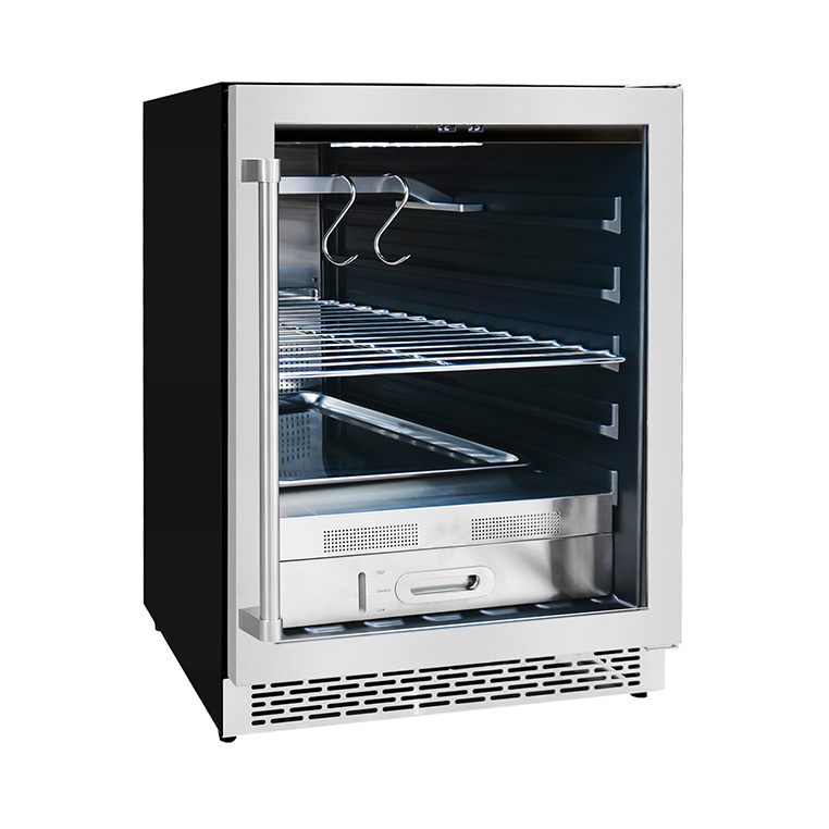 Лаконичный корпус из нержавеющей стали со стеклянной дверцей из трёхслойного ударопрочного стекла с энергосберегающим покрытием LOW-E подчёркивает премиальный характер устройства и делает процесс вызревания визуально открытым. Благодаря сдержанному дизайну шкаф гармонично вписывается в современные кухни и гастрономические пространства, а возможность встраивания в мебель расширяет сценарии размещения.