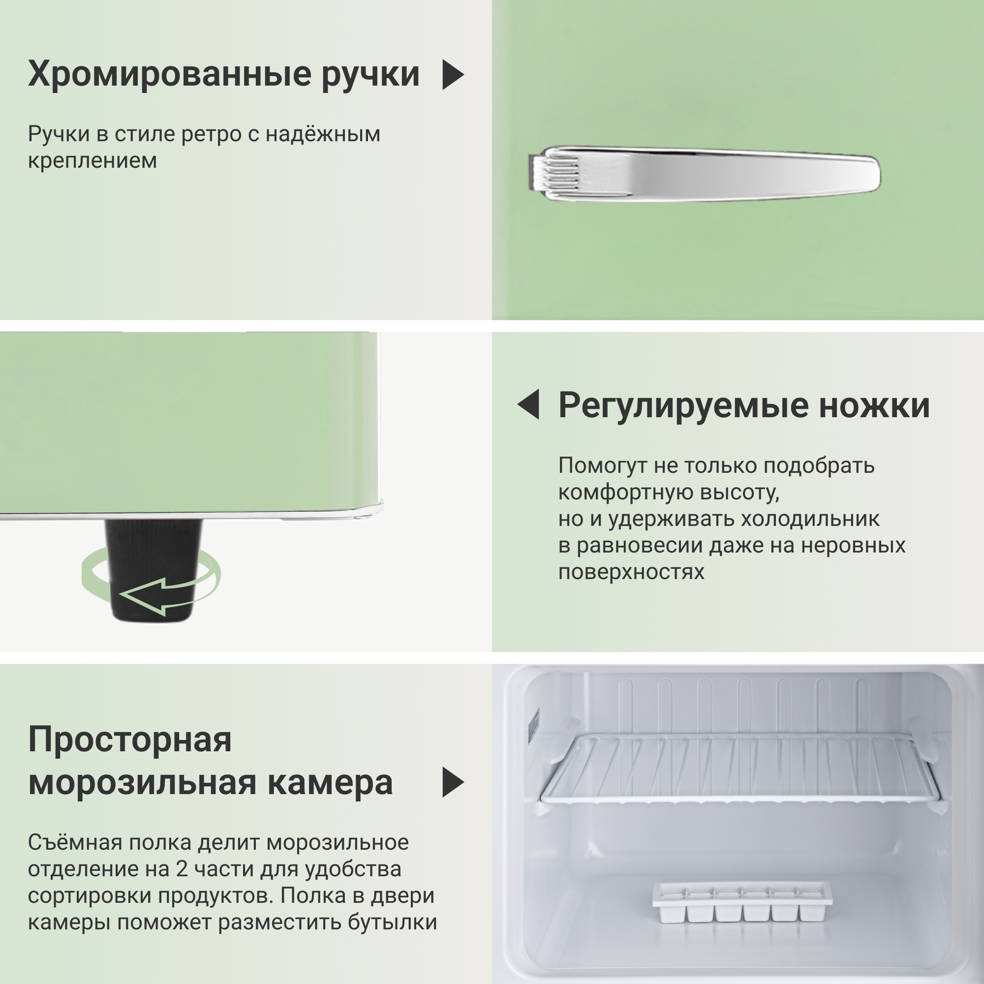 Регулируемые ножки помогут не только подобрать комфортную высоту, но и удерживать холодильник в равновесии даже на неровных поверхностях.