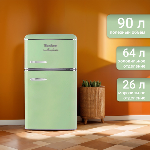 Холодильник Tesler RT-95 сочетает в себе надежное охлаждение, элегантность и функциональность. Выполненный в ретро-стиле, он придаёт особый шарм пространству вокруг, что делает его идеальным дополнением к кухне. Благодаря небольшим размерам он может быть установлен даже в ультракомпактных пространствах.