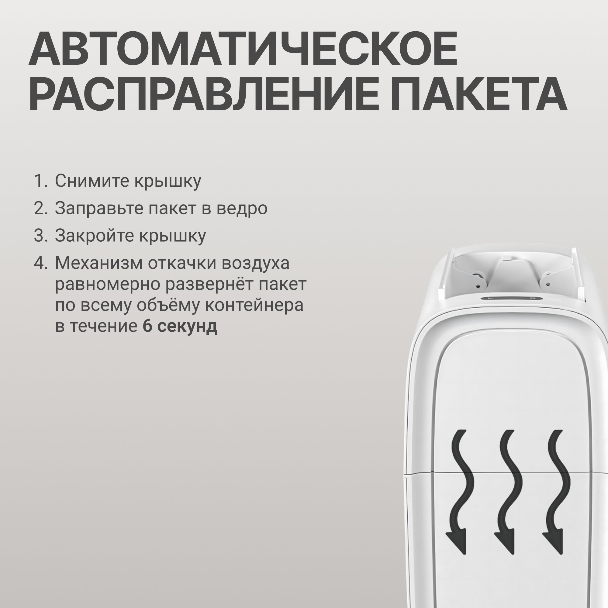 Модель оснащена системой автоматического расправления пакета: вакуумный механизм равномерно распределяет его внутри ведра. Это упрощает использование, сохраняет чистоту и исключает необходимость ручного выравнивания.
