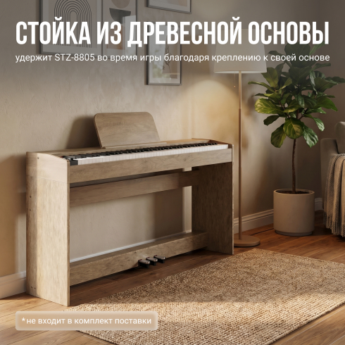 Вы также можете дополнительно приобрести подставку под данный инструмент – ST-8805. Она надёжно удерживает пианино во время игры благодаря креплению музыкального инструмента к своей основе. При установке цифрового пианино на данную подставку инструмент будет иметь ту же высоту клавиш, что и акустическое фортепиано, что подарит исполнителю комфорт при занятиях музыкой.