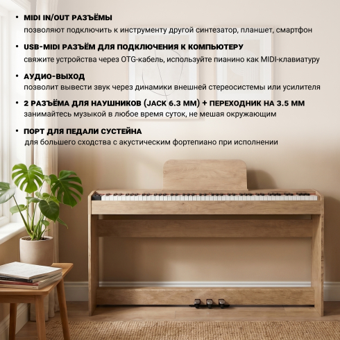 Педаль сустейна, идущая в комплекте, поможет создать объём звучания для большей выразительности при исполнении.